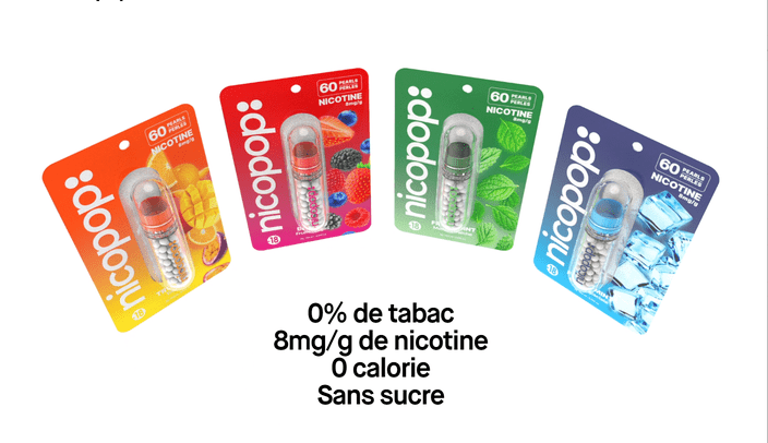 尼古丁珍珠是一种戒烟辅助剂,在法国以“Nicopop”品牌销售,其形状为珠子,具有调味糖果的味道。