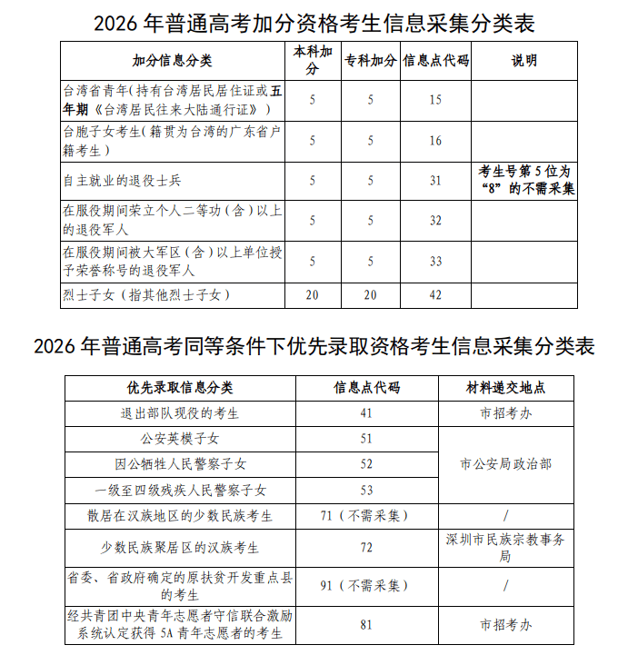 在《2026年普通高考加分资格考生信息采集分类表》《2026年普通高考同等条件下优先录取资格考生信息采集分类表》(见下图)中,凡信息点代码栏未注明“不需采集”的加分资格和优先录取资格类型,均在普通高考报名时申报。