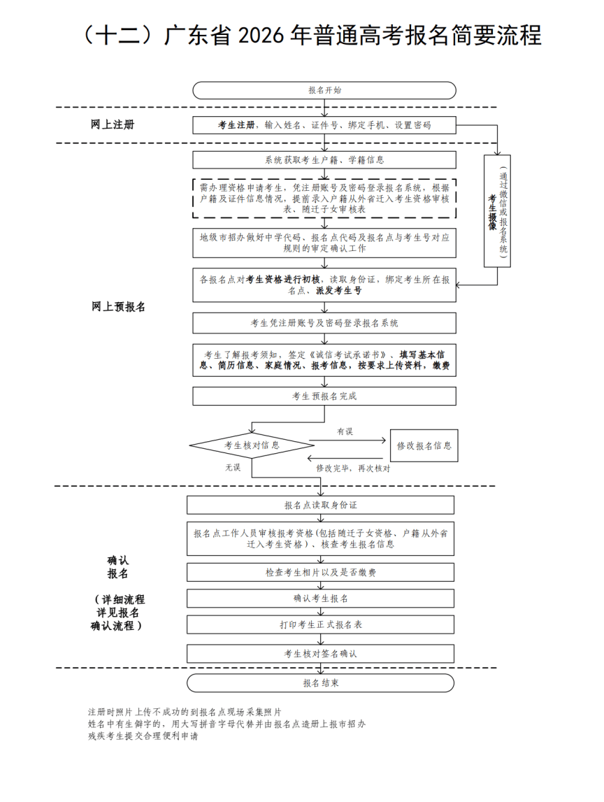 报考信息非常重要,信息错误将造成严重后果,报名时请务必认真核对报考信息,报名后如个人信息发生变化须及时主动申请修改。具体请联系报名点或当地市县招生办,按照“广东省2026年普通高考考生信息修改审核流程”进行更正,信息更正办理时段为报名结束后至2026年4月30日以及2026年6月10日至6月12日(注:开考后不再受理高考报名所使用户籍被注销考生的修改信息申请),因考生未及时提交修改信息申请而造成的遗留问题由考生本人承担责任。